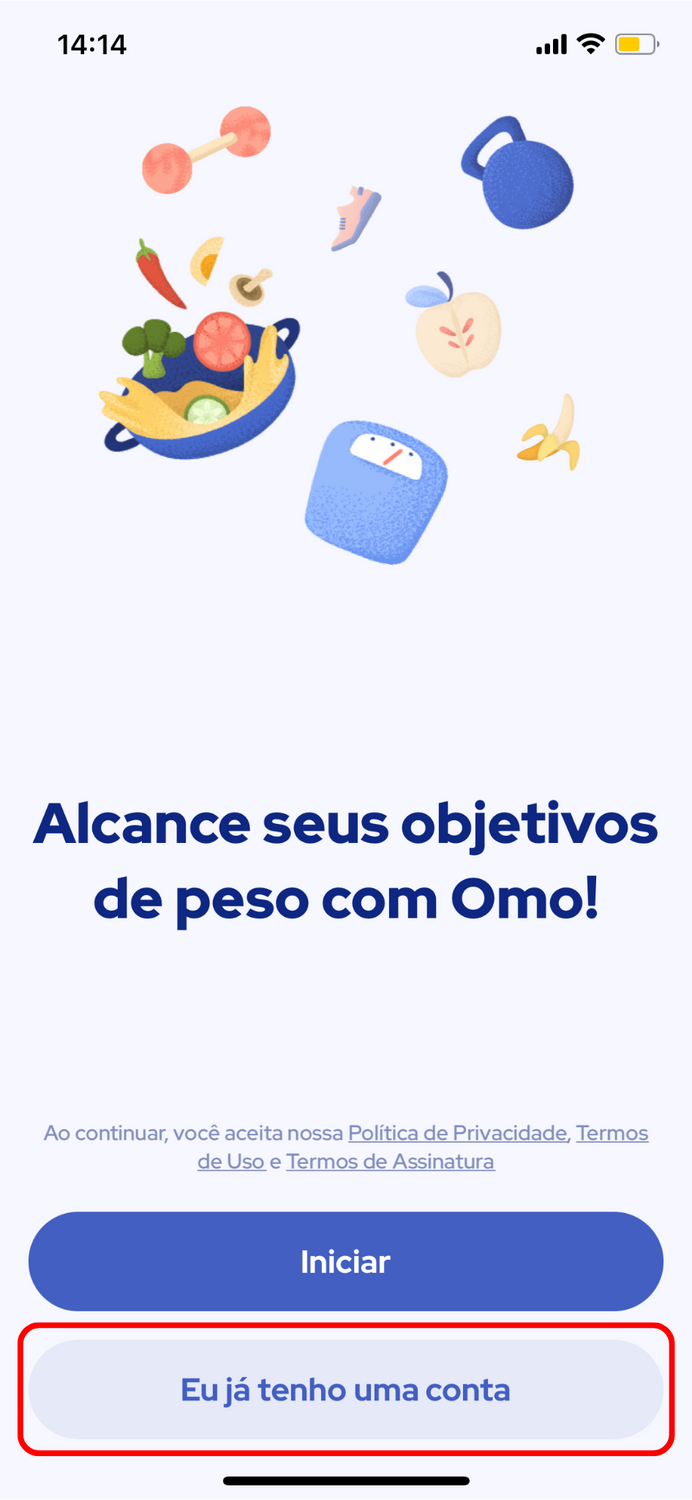 2. Abra o app e clique na opção 'Eu já tenho uma conta' na primeira tela do app, conforme imagem abaixo: